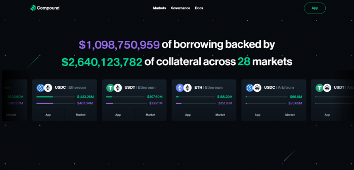 Compound Finance is an EVM-compatible DeFi lending protocol that uses algorithmic money markets for lending and borrowing.
